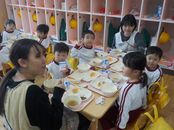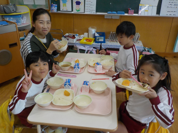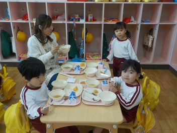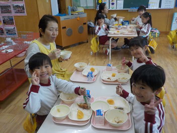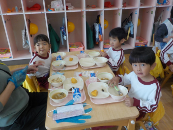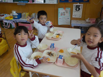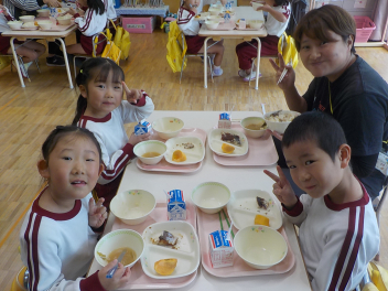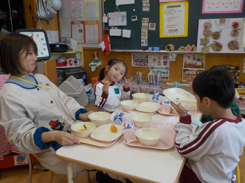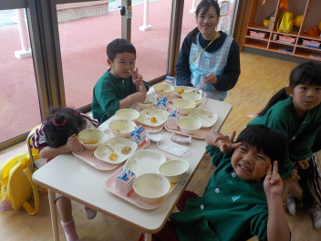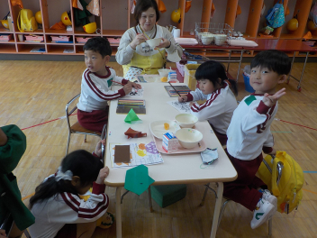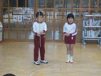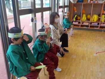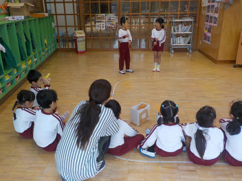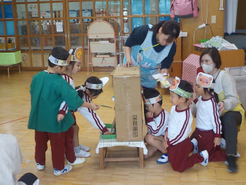 ちょっと堅い話ですが・・・。本園は、卒園児のほぼ全員が井伊谷小学校に進学することから、小学校生活に円滑に移行できるように、本園の年長児と井伊谷小1年生の2年間を「架け橋期」として、小学校と連携して教育計画を作っています。この計画を「架け橋プログラム」と言い、2年目を迎えました。本年度は、園から「生活科の授業に参加させてほしい」と依頼したところ、本日の生活科「なかよしまつり」に招待してくださいました。みんなで行ったところ、なんと本園だけでなく、引佐保育園・伊平幼幼稚園も一緒でした。小学校のやる気満々の姿勢に脱帽です