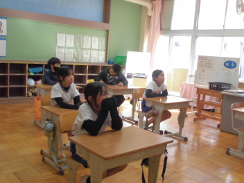 みさと幼稚園の子たちが、1年生の教室に給食の配膳の様子を見学にきました