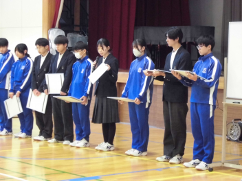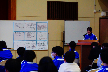 完走大会や研修旅行などの行事や日々の生活の中からみんなに伝えたいことなど、それぞれの代表児童生徒が発表します。