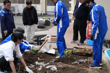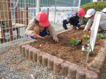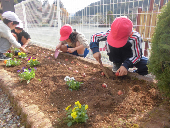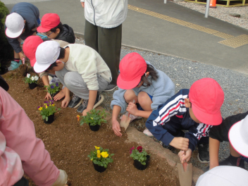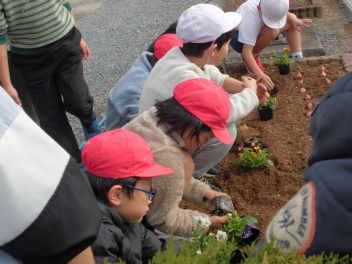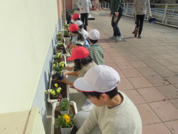 • 8日、1,2年生が花壇とプランターに、冬の花の苗植えをしました。
