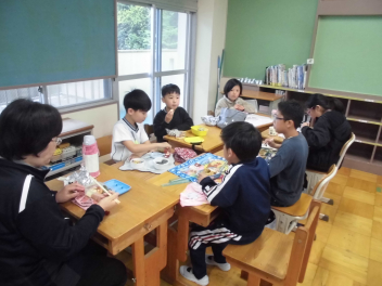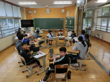 初等部はみんなで集まって、縦割り班ごとにお弁当を食べました。