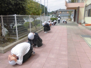 余震が起こった時には、その場所で体を小さくして頭を守ります。