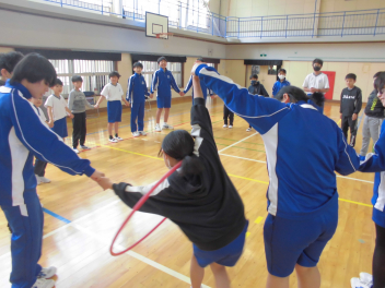 フラフープの輪を手をつないだまま、最後の人までくぐっていきます。
