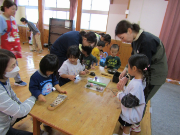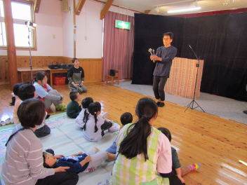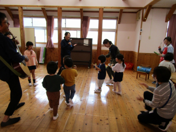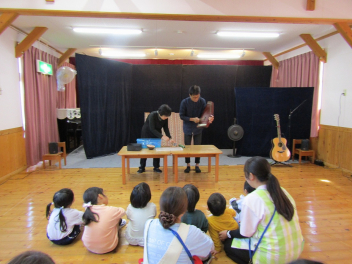 人形劇を観たり、いろいろな楽器に触れたりしました。また、好きな楽器を選んで、ギターに合わせて合奏しました。楽しかったね。