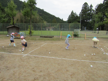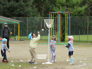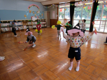 「なげておどって かわいい玉入れ」は、音楽に合わせて踊り、曲の合間に玉入れをしました。