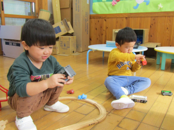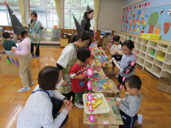 戸外では、玉入れをしたり、遊具に乗ったりして遊びました。部屋では、3,4歳児のお店屋さんに買い物に来てもらったり、屋台を引いたりしました。今年度最後の交流でしたが、異年齢同士の関わりができ、楽しい時間を過ごすことができました。