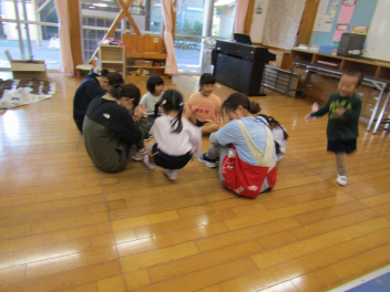 ふれあい公園で、どんぐりなどの木の実や木の葉を集めたり、花いちもんめをしたりして遊びました。