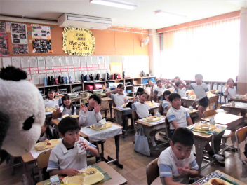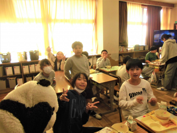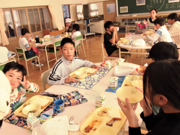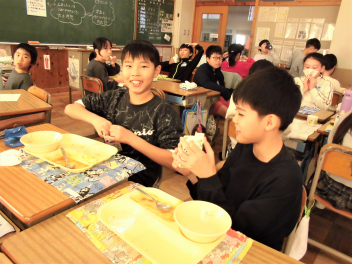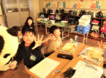 4年生以上は2グループに分かれ、ミシンを使って縫ったり、巾着にひもを通したりしています。
