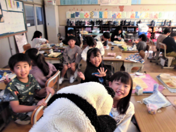 他のクラスでは、ハロウィンの日に、紙皿でバッグを作りました。