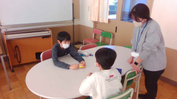 どの講座も名刺交換からスタートです。オリジナルで作った名刺を交換します。名刺の渡し方や好きなものの話をして、講師と子供たちの距離を近づけます。