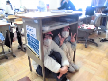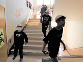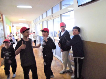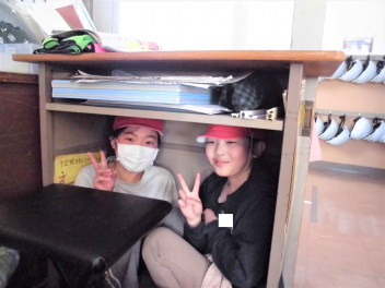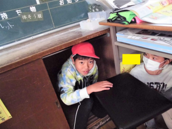 6年生も赤帽子をかぶり、隠れます
