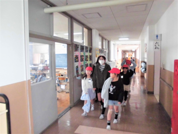 6年生と手をつないで歩く下級生たち