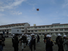 凧揚げ会場とはまったく条件が違う、狭い校庭の中での凧揚げ。