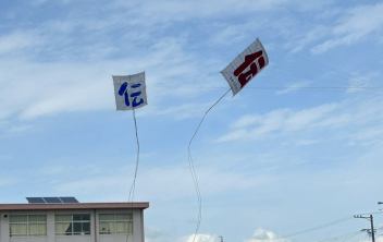 入野凧揚げ会の方たちのご協力で出来上がった「伝」の字が書かれた立派な凧。