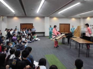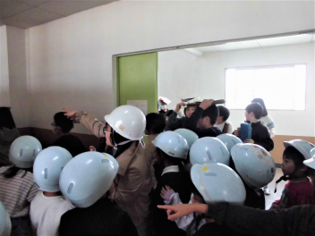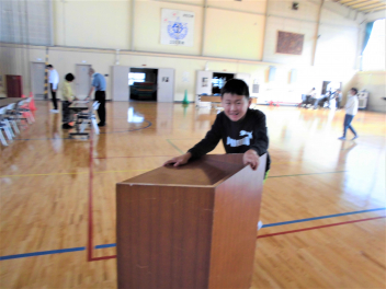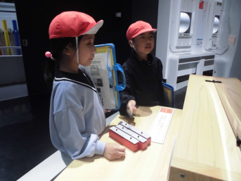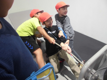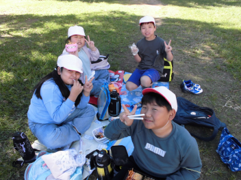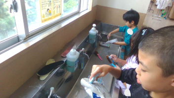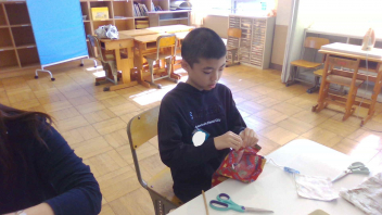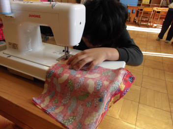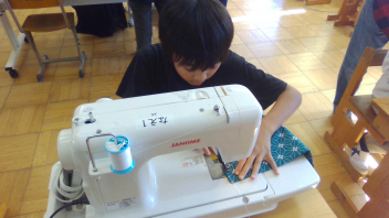 4年生以上は2グループに分かれ、ミシンを使って縫ったり、巾着にひもを通したりしています。