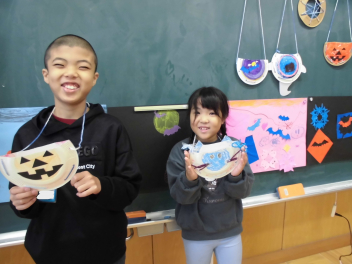 他のクラスでは、ハロウィンの日に、紙皿でバッグを作りました。