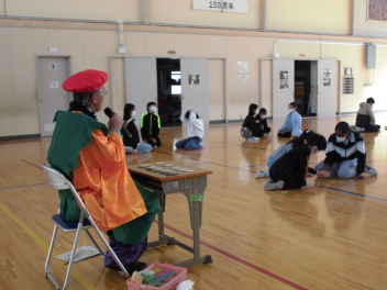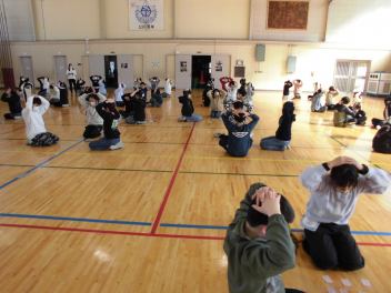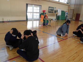緊張感の漂う本番直前の体育館では、全員真剣に説明を聞いています。