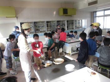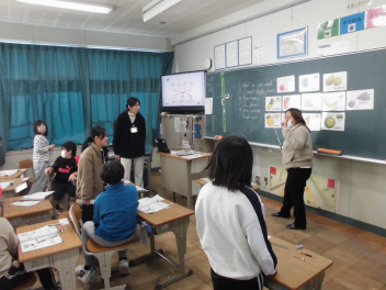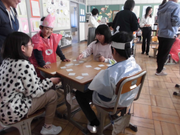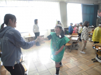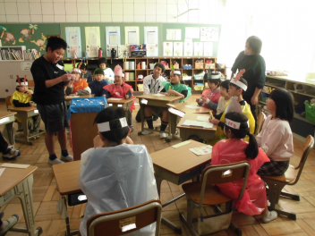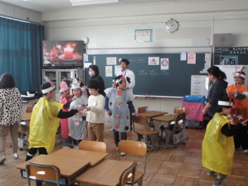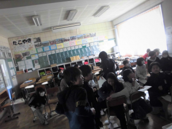 (↓) 体育館で実施するつもりでしたが、感染対策としてオンライン開催。一部クラスのみランチルームに集いました。