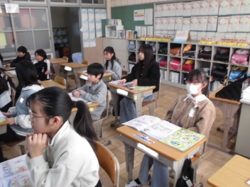 (↓) 5年2組;亜弥先生と家庭科の授業です。快適な住まいについて、様々な意見が交わされていました