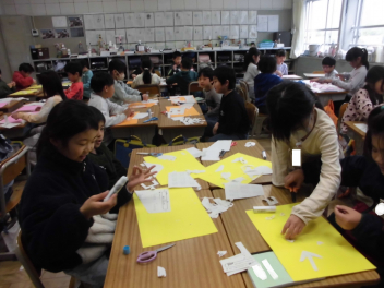 (↓) 2年2組;山岡先生と図工の授業です。紙をいろいろな形に切り抜き、素敵な切り絵ができていました