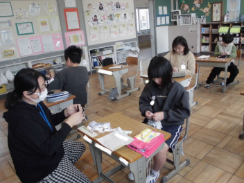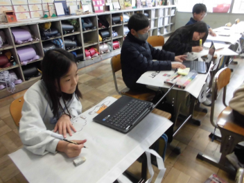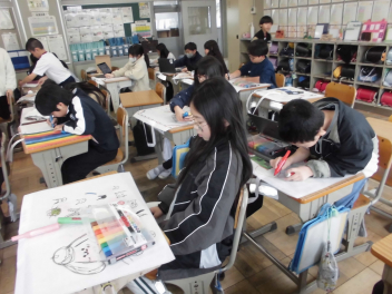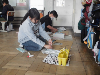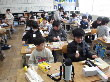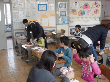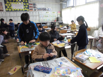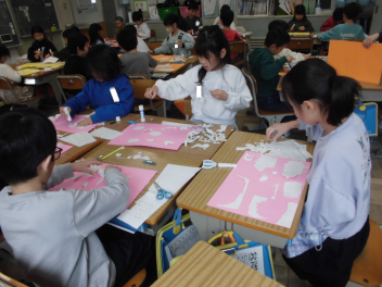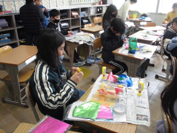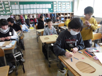 (↓) 4年1組;こちらも図工。教頭先生との授業です。年度末らしく、これまでの作品を収納するバッグに模様を施していましたsurprise