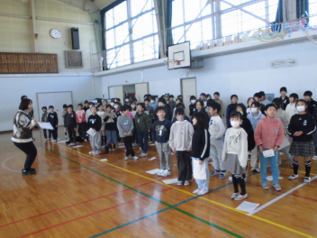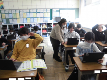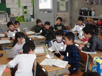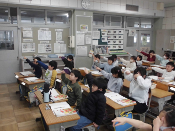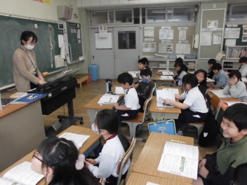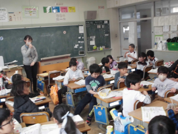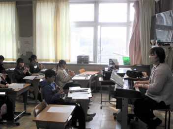 (↓) 2年1組;山岡先生と音楽の授業。春を感じる歌をみんな楽しく歌っています