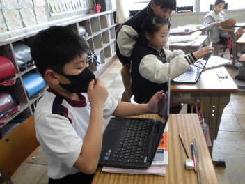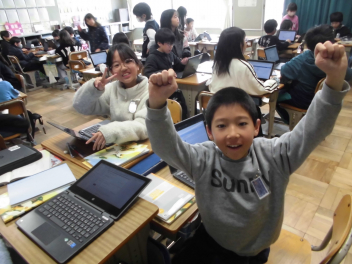 (↓) 4年1組;岡田先生と国語の授業です。資料を整理する練習として、自分たちで「模擬アンケート → 回答の集約」を行います。タブレットを使いこなしておりますよ