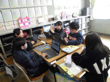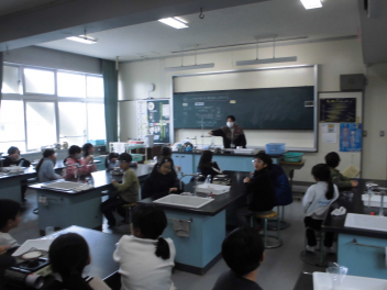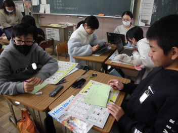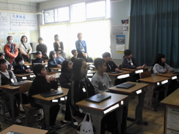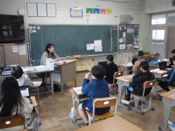 (↓) 4年3組;孝美先生と社会科の授業です。地域に関する事柄を取り上げ、CMが作られるようで…。