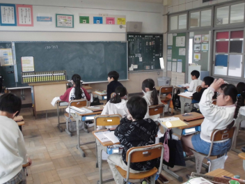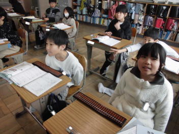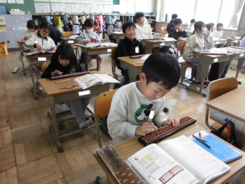 (↓) 3年3組;齋藤先生と算数の授業。「そろばん」の基本的な扱い方について学習中です