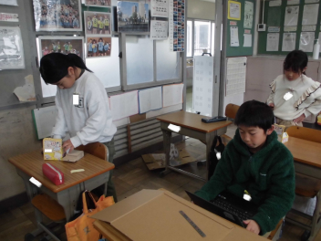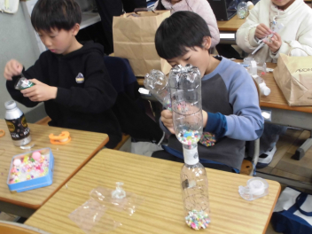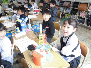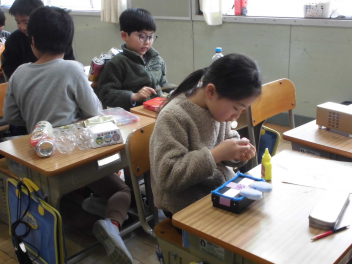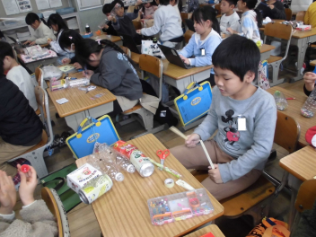 (↓) 2年1組;石田先生と図工の授業。箱や空き缶などを組み合わせ、オリジナル楽器を作っておりました。
