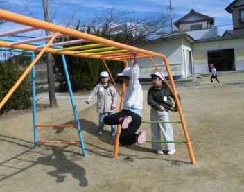 (↓) まずは、16日昼休みの風景を…。遊具で遊んだり、ドッジボールやサッカーに盛り上がったりwink