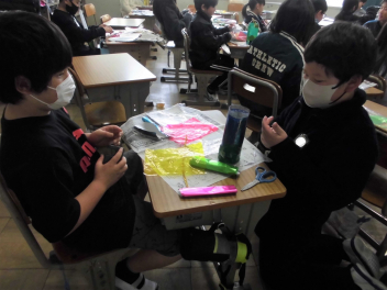 (↓) 4年3組;孝美先生と、こちらも図工の授業。色付きセロハンをきれいに重ね、幻燈ができ上がるようです…laugh