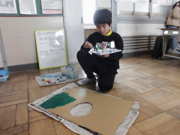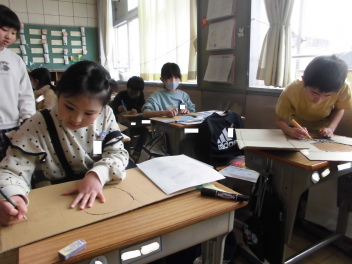 (↓) 3年1組;こちらも図工。大軒先生との授業です。大きな段ボールを切り抜いたり、そこに絵を描いたり。豊かな世界が広がっておりました