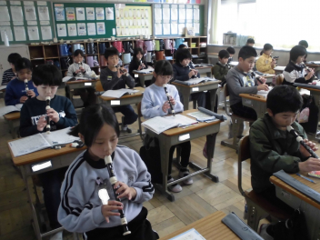 (↓) 3年1組;詩織先生と音楽の授業です。約1年という時間をかけただけあり、リコーダーの演奏も上手になっています