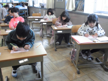 話を聞いた後、子供たちは、思いを届けたい人を心に浮かべ、鉛筆を走らせました