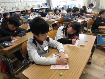 (↓) 6年3組;書写の授業です。卒業が近づき、『硬筆ワーク』もほぼ終了となっております。