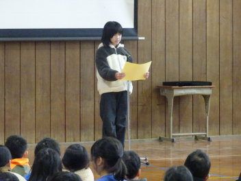 1つ目は、3学期にある「6年生を送る会」についてです。6年生にとって、卒業する学校が伊佐見小学校でよかったと思ってもらえるような、感動的な会を5年生全体で成功させたいです。そのために、一人ひとりが、自分の役割に一生懸命に取り組めるようにしていきたいと思います。私は学級委員として、これまで5年2組に呼びかけの声をかけたり、みんなが一生懸命に取り組める見本となるように、自分なりに努力したりしてきました。「6年生を送る会」でも学級や学年の子たちに声をかけ、5年生全員で「6年生を送る会」を成功させたいです。