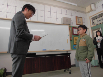 (↓) 会議室では、各学年第1位の子に賞状を手渡しました