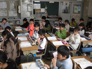 (↓) 2年2組;山岡先生と音楽の授業。授業者のオルガンと合わせながら、子供たちは鍵盤ハーモニカの練習に励みます