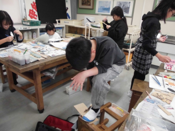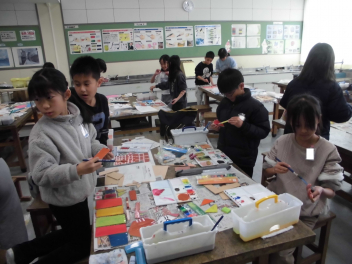 (↓) 4年2組;孝美先生と図工の授業です。板材をのこぎりで切り分けたり、絵の具を使って色付けしたり…