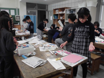 (↓) 1年1・2組;梅田先生、弥生先生との授業。色を付けたり、形を変えたり……たくさんの素敵なものができていますwink