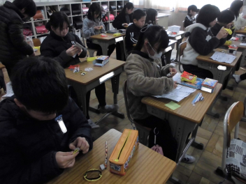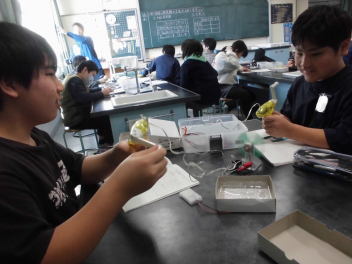 (↓) 6年1組;本樫先生、河辺先生と理科の授業。手動の発電機や光電池を用いての発電実験に取り組みました。風車は回るし、オルゴールから曲も流れたしwink