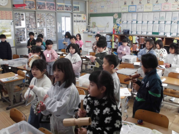(↓) 1年2組;弥生先生と音楽の授業。タンバリン、トライアングル、カスタネットなど、数種類の楽器を鳴らして楽しみました