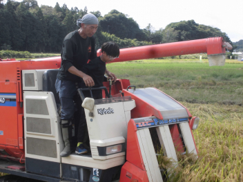 その後、コンバインにて刈り取り作業が進むさまを見せていただきました。幸運な代表者たちは「コンバイン乗車(一部運転)体験」もsurprise