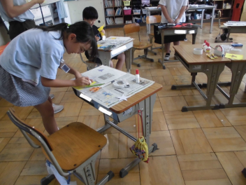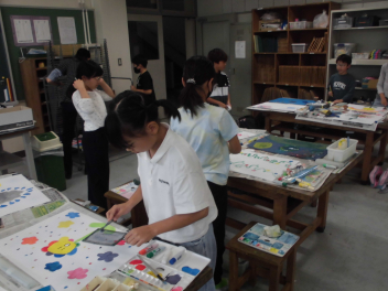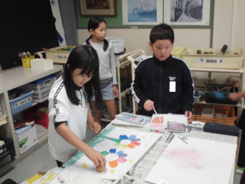 (↓) 4年3組;孝美先生との図工授業。スパッタリングやローラー、スタンプなど、様々な用具を用いての表現ですsurprise