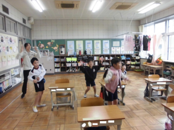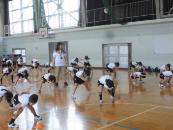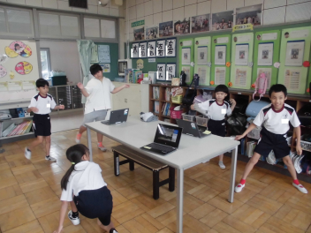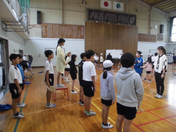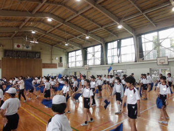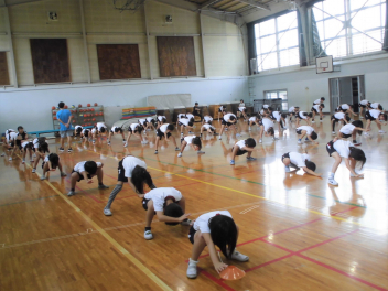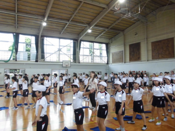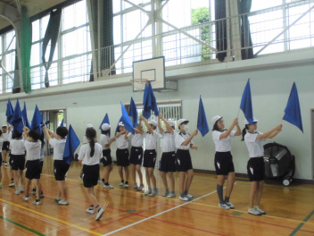 (↓) 5・6年生;表現演技「フラッグ」の練習。