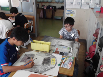 (↓) 6年1組;本樫先生と図工の授業です。校内の大切な風景を絵画で表現しますwink