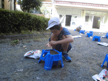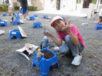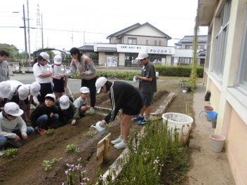 (↓) 2年1組;石田先生との生活科授業。二十日大根の種まきです。しっかりと育ってほしいなあ
