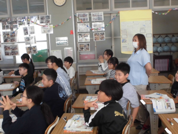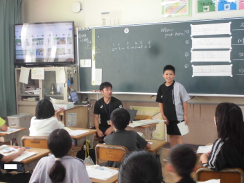 (↓) 5年2組;田口先生、ALTのヴェア先生との外国語授業。「My hero is ~」を発表し合っていました