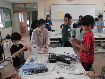 (↓) 4年1組;教頭先生と図工の授業です。素敵な四輪車を走らせておりました